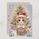 The background sets a magical scene with a sparkling Christmas tree, soft falling snow, and elegant pastel roses in blue and pink. This card is perfect for cat moms, kids, or anyone who loves cute animals.