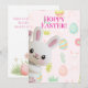 The soft pastel background is decorated with colorful Easter eggs, delicate leaves, flowers, and tiny bunny illustrations, creating a cheerful springtime pattern that feels bright, festive, and full of seasonal charm. The combination of gentle colors and cute character design makes this card perfect for both kids and adults