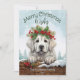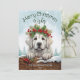 Cette adorable carte de voeux de vacances présente une jolie illustration de Chien des Pyrénées, portant une couronne festive de fleurs d'hiver, de saints, de pins et de baies, avec des flocons de neige tombant doucement contre une scène de forêt de neige rustique. Les Grands Pyrénées jettent un coup d'oeil sur le rond enneigé pour dire bonjour ! Le texte ludique "Joyeux voeux de Noël" ajoute une chaleureuse salutation saisonnière, et peut être customisé comme vous voulez. L'envers est décoré d'un chèque en plastique classique, ajoutant une touche traditionnelle à l'ensemble. Cette carte, mignonne et ludique, est parfaite pour envoyer des encouragements de vacances à la famille et aux amis, et le nom et la date personnalisables en font un gardien personnalisé.
