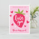 Valentine's day flat greeting card with cute strawberry and hearts illustration and pattern. Modern script lettering "love you" and "You're berry sweet". Pink colors.