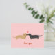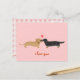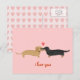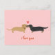 Shorthaired red Dachshund and long haired black and tan Dachshund cartoon dogs with heart on pink postcard. A cute Valentine’s Day, anniversary or general love card for wiener dog lovers. Text can be personalized with your own greeting for any occasion. Impress your special someone with a sweet weenie dogs love card. Check out Jenn’s Doodle World for even more dog breed art and illustration for sale on greeting cards and gifts for the dog lover in your life.