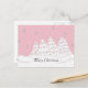 Un arrière - plan rose doux avec des arbres de Noël blancs et rêvés, de minuscules lumières, des pics enneigés et des petites flocons de neige qui descendent.