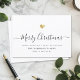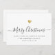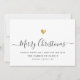Carte de vacances familiale minimaliste moderne avec calligraphie élégante qui dit Joyeux Noël sous un cœur doré imprimé. En dessous, il y a de l'espace pour votre message personnalisé ainsi que de l'espace supplémentaire au dos pour des salutations plus détaillées.