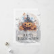 Belle carte Halloween avec une maison hantée, citrouilles et chauves-souris. Personnalisez facilement cette carte d'Halloween aquarelle avec votre nom de famille et votre texte.