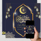 Envoyez vos meilleurs vœux pour l'Eid à votre famille, vos amis et vos proches avec notre carte de vœux Eid Mubarak élégante et moderne avec calligraphie arabe, croissant doré, lanternes suspendues islamiques et ornements, mandala floral sur fond bleu marine. Elle contient de beaux vœux pour l'Eid. Modèle personnalisable que vous pouvez facilement modifier ou supprimer, c'est votre choix.