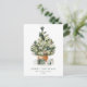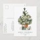 Elégante carte postale de vacances ornée d'un arbre de Noël aquarelle festif orné d'ornements en verre et entouré de cadeaux enveloppés. Personnalisez la carte postale en ajoutant un message personnalisé, votre nom de famille et l'année. La carte postale de Noël des fêtes de fin d'année s'inverse pour afficher votre adresse de retour et votre message personnalisé en lettres vertes.