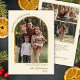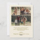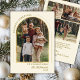 Elégante Gold Arch 4 Bonnes Fêtes photo Bonne Carte de vacances. Célébrez la saison avec élégance grâce à cette carte de Noël familiale et élégante, dotée d'un cadre photo moderne en arc de cercle couleur or. Personnalisez-le avec vos photos de famille préférées, le nom de famille, et l'année sur arrière - plan beige neutre blanc ou crème. Le design minimaliste festif est mis en valeur par d'élégantes typographies de Bonnes Fêtes couleur faux or, créant un look chaleureux et intemporel. Le dos montre 3 collage photo avec bordure dorée et modèle de message de vacances avec des noms de lettres à la main. Une carte de vacances parfaite à partager en famille et entre amis en hiver.