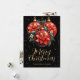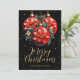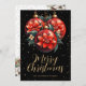 Elegant black and gold Christmas card featuring red floral Christmas ornaments against a starry background.