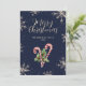 Elegant blue Christmas card featuring sparkling snowflakes, candy canes, holly and red berries on a dark blue background.
