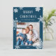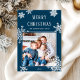 This timeless elegant Merry Christmas holiday card features white snowflakes on a rich jewel-toned deep blue background, with a family photo and classic text.