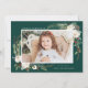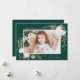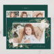 Elégante carte de vacances affichant votre photo préférée sur le devant encadrée de bouquets de fleurs d'ivoire, feuillage vert luxuriant, cônes de pins et baies sèches contre un arrière - plan vert de forêt. Personnalisez l'avant de la carte en ajoutant un message d'accueil personnalisé et votre nom. Le dos affiche 3 autres photos avec espace pour l'année, un message personnalisé, et les noms de votre famille contre un arrière - plan vert. Conçu pour coordonner avec notre collection de vacances florales hivernales.