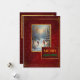 Celebrate the magic of the season with this Elegant Christmas Card, featuring a warm winter cottage scene framed by a luxurious red and gold patterned border. The design evokes timeless holiday charm with a vintage victorian touch