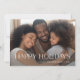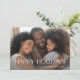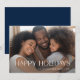 Cette carte de Noël simple et élégante présente votre photo personnelle préférée, avec une typographie décorative blanche moderne qui dit "Joyeuses Fêtes". Le verso de la carte est d'une teinte foncée de bleu marine.