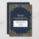 Send sophisticated Thanksgiving greetings with this Luxury Gold Foil Theme Card. Featuring an elegant design of intricate gold metallic fall leaves and berries bordering a deep navy blue background. Perfect for a chic, formal, or corporate Thanksgiving message. Customize with the recipient's name for a truly personalized and upscale holiday greeting.