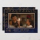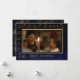 Magnifique Carte de Noël Joyeux Personnalisée sur un arrière - plan bleu foncé avec des petites étoiles et des motifs de flocon de neige autour du cadre et à l'arrière. Vous pouvez remplacer la photo par la photo de votre famille ou de votre couple. Vous pouvez mettre à jour tout le texte.