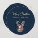 Elégante carte de Noël Joyeuse bleu et or avec un accueil de vacances en or lettré à la main et un cerf aquarelle sur un arrière - plan bleu orné de neige dorée. Personnalisez facilement cette carte de vacances bleu et or avec votre nom de famille et un message. L'effet de feuille d'or n'est simulé que dans l'illustration.