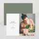 A stylish minimal photo holiday card with classic typography "Merry Christmas" in black on a clean simple minimalist white background and a grayish forest green feature color on the reverse. The photo, holiday greeting and name can be easily customized for a personal touch. A simple, minimalist and contemporary christmas design to stand out this holiday season! The image shown is for illustration purposes to be replaced with your own photo. The placeholder image is of a woman sitting with her gorgeous corgi dog with a festive wreath round her neck.
