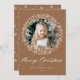 Elégante carte de vacances avec votre photo entourée d'une couronne de flocons de neige et de branches de pin blanc sur un arrière - plan festif couleur pain d'épices. "Joyeux Noël" est affiché dans un script de calligraphie blanc gras avec votre nom et l'année indiquée ci-dessous. Le dos de la carte de vacances moderne dispose d'un magnifique motif de flocon de neige.