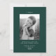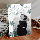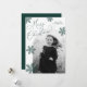 Elégant carte photo de vacances avec votre photo verticale encadrée par une arche blanche et des flocons de neige vert d'épinette. "Joyeux Noël" est affiché dans un script de calligraphie vert d'épinette. Personnalisez l'avant de la carte de Noël de flocon de neige en ajoutant votre nom. La carte inverse pour afficher une photo supplémentaire, l'année, et votre message personnalisé en lettres blanches sur un arrière - plan vert foncé.