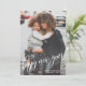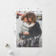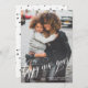 Elégante carte de nouvel an avec un tourbillonnant script blanc superposé disant heureux nouvel an au-dessus de votre photo. Ajoutez vos noms et l'année. Le dos est recouvert d'une sorte de confettis noir et gris.