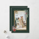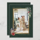 Elégante photo verte et or Joyeuse carte de Noël ornée d'un cadre photo vert foncé et or décoré d'aquarelles illustrant des poinsettia, lanterne et ornements sur une branche de pins. Personnalisez facilement cette carte de vacances photo aquarelle avec votre photo et votre texte.