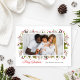 La carte de vacances "Joyeux Noël" présente un design de feuilles de verdure fleuris et de baies encadrant une photo horizontale rectangulaire. Inclut un texte de bienvenue élégant et moderne, ainsi que du texte personnalisé qui peut être personnalisé à l'avant et à l'arrière de la carte. Deux espaces photo carrés bonus et un motif floral coordonné habillent le dos de la carte. Le design comprend des tons classiques de rouge et de vert associés à des couleurs neutres, blanches, grises et taupes.