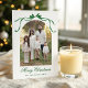 Envoyez des salutations festives avec cette carte de Noël élégante avec un arc vert d'aquarelle et un ruban design. L'avant met en évidence une photo préférée dans un cadre en arc accentué par l'arc peint à la main, tandis que l'arrière comprend un montage de trois photos pour présenter plus de souvenirs de vacances. Personnalisez avec votre nom et votre message pour créer une carte de Noël intemporelle qui allie style classique et format multi-photo moderne.