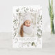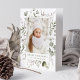 Elégante carte de vacances avec votre photo verticale encadrée en blanc avec un arrière - plan de canneberges d'aquarelle, saint, feuilles d'eucalyptus, et feuillage vert sauge luxuriant. Personnalisez l'avant de la carte photo botanique de Noël avec un accueil personnalisé et votre nom de famille en lettres vert sauge. L'intérieur de la carte affiche votre message personnalisé ou laissez-le vide pour écrire le vôtre.