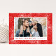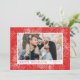 Elégante carte de vacances avec votre photo horizontale encadrée de fleurs poinsettia blanches, pinecones et pignons de pin sur un arrière - plan rouge festif. "Happy Holidays" est affiché en lettres rouges classiques avec le nom de votre famille à droite. La carte de vacances moderne s'inverse pour afficher un motif botanique rouge assorti.