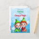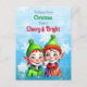 Une jolie carte postale de Noël avec une petite fille mignonne et des elfes de garçon en vert et rouge avec des flocons de neige Rétro se sentant vieux mode Noël.