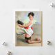 Elvgren Pin Up Girl Art. Une femme vêtue d'un tablier blanc et de talons rouges s'agenouille dans une cuisine, tenant un plateau de nourriture brûlée avec la fumée qui monte. Son expression laisse présager la surprise en regardant au-dessus de son épaule.