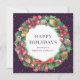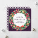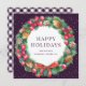Carte de vacances de Noël en en vichy violet avec une couronne d'aquarelle de Noël de branches, cônes et rubans rouges. Personnalisez facilement cette carte de vacances d'affaires violette avec votre nom d'entreprise.