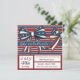 Des coquettes amusantes et audacieuses apparaissent en face de cette invitation personnalisable de célébration du 4 juillet. Les vaches ont des étoiles patriotiques et des rayures apparaissant sur elles et sont devant un arrière - plan rayé rouge et bleu et blanc solide. L'envers de cette invitation de partie personnalisable a un arc surdimensionné avec le même arrière - plan rayé.