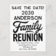 This family reunion save the date features a clean, modern black and white layout with bold typography for a sophisticated yet approachable look. The clear, organized design ensures all essential information—including name, date, and location—is easy to read for relatives of all age