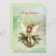 Une jolie fée portant un casquette rouge est assise sur un ornement de Noël vert décoré de feuilles saints et de baies tandis que des flocons de neige tourbillonnent autour d'elle. Les mots "Joyeux Noël" et le salut au verso de la carte peuvent facilement être changés à n'importe quel salut que vous préférez.