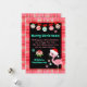 This cute and fun holiday card can be personalized with a family name or title. It features an adorable flamingo in a santa's hat on a pink and red plaid background. The text combines sans serif fonts for a stylish and modern look. Winter snowflakes and patterned baubles add a festive touch.