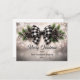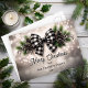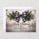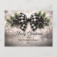 Elegant nostalgic watercolor black and white gingham check beribboned pine and berries holiday bough on bokeh snow background "Merry Christmas" non-photo greeting design with coordinating back design.