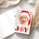 Festive typography-based Christmas card features "JOY" on the front in vibrant red retro-style letters with a snowflake standing in for the "O." Your vertical or portrait oriented photo appears beneath the text overlay in full bleed. Personalize the inside with a custom pre-printed message and signature.
