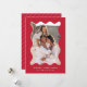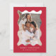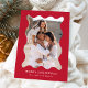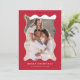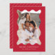 Envoyez des salutations festives à vos amis et votre famille avec ce carte photo de vacances branché! La simple carte de Noël affiche votre photo verticale encadrée dans un cadre ondulé de style rétro rouge. Personnalisez la carte de vacances minimale avec un accueil personnalisé (comme Joyeux Noël) et votre nom de famille en lettres blanches. La carte s'inverse pour afficher un motif à bandes en diagonale rouge et blanche.