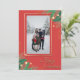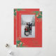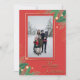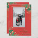 Envoyez des salutations de vacances classiques avec ce carte photo de Noël joyeux rouge festif. Le design comprend un élégant script doré, des étoiles brillantes et des branches à feuillage persistant avec des ornements encadrant vos photos préférées à l'avant et à l'arrière. Personnalisée avec votre nom de famille et votre message saisonnier, cette carte à plat est une belle façon de partager des souhaits chaleureux avec des amis et des proches ce Noël.