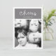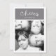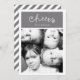 Cartes de Noël modernes avec photo avec le mot, en police blanche mignonne, "Cheers", sur arrière - plan gris, et un simple motif rayé gris et blanc, avec bandes diagonales.