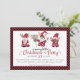 "Jolie carte de Noël de fête de gnomes aquarelle." Illustration aquarelle fantaisiste et amusante d'une famille de gnomes et de leurs rennes vous invite à une joyeuse petite fête de Noël ! Le carreau de Buffalo rouge et noir encadre l'avant et remplit l'arrière. Œuvre d'Audrey Jeanne Roberts, copyright.