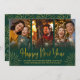 Carte photo Bonne Année verte et or fantaisiste. Cette carte de vacances élégante présente un beau "Bonne Année" calligraphique moderne et un collage de trois photos élégant. Un modèle de design festif mais moderne pour partager vos souvenirs préférés.