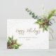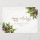 Carte Happy Holidays blanche et or avec cadre de neige orné de branches de sapin, cônes et saint aux baies rouges. Personnalisez facilement cette carte de vacances élégante avec votre texte.