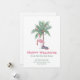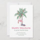 Flamingo de Noël avec un chapeau de Père Noël et un palmier décoré. Joyuses Fêtes de notre nouvelle maison pour les Fêtes . Carte . Le modèle est configuré pour que vous puissiez ajouter les détails de votre nouvelle adresse et rester en contact avec vos amis et votre famille pendant la période des fêtes .