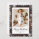 Photo rustique Joyeuse carte de Noël avec flocons de neige, étoiles et chute de neige contre un arrière - plan en bois. Personnalisez facilement cette carte de vacances rustique avec votre photo et votre texte.