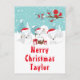 Cette carte de vacances mignonne et amusante peut être personnalisée avec un nom ou un titre comme fille, petite-fille, nièce, ami etc. Il abrite une adorable famille de renards arctiques dans un cadre merveilleux hivernal avec des arbres enneigés et un oiseau rouge sur une branche avec un saint. Les renards aux chapeaux de Santa apportent une touche festive. Dans l'arrière - plan se trouve un ciel vert bleu turquoise et des flocons de neige tombants. Le texte combine les polices décoratives et sans serif pour un look élégant et moderne. C'est parfait pour Noël.