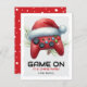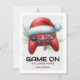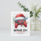 Gaming kids classroom christmas cards featuring a simple white & gray background, a red games controller wearing a santa hat, with the pun greeting "game on it's christmas", and the childs name at the bottom.