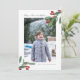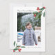 Une carte de vœux de vacances moderne avec beaucoup d'espace blanc. Votre photo préférée au format portrait prend la vedette, rehaussée de deux branches de baies aquarelles vertes et rouges. Le titre de la carte se lit « Gloire à Dieu au plus haut » (la salutation angélique populaire dans l'histoire de la nativité) dans une police de caractères cursive vert sauge, qui est modifiable. Terminez avec votre nom de famille. Le verso présente un motif aquarelle de baies et de branches sur fond vert sauge.