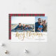 Gold Script "Merry Christmas" en faux glitter with red tartan pattern backing, 2 photo Christmas card.